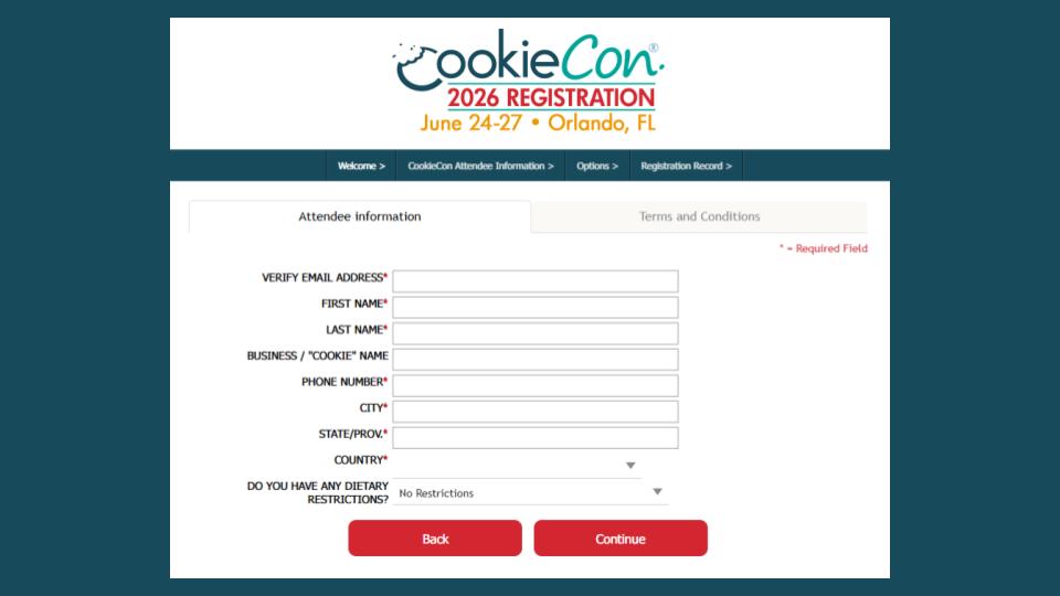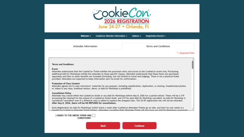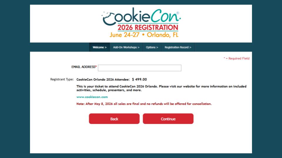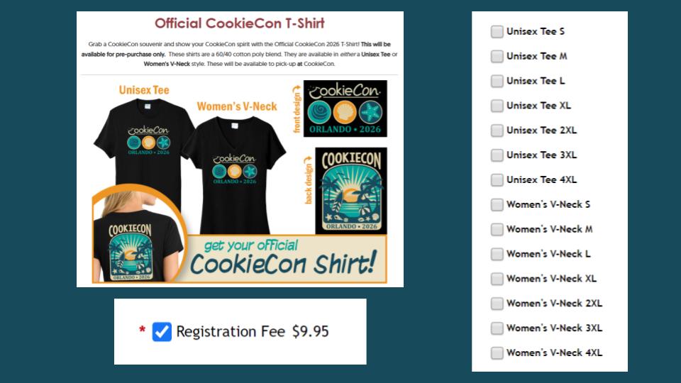 This is where you can purchase the official CookieCon T-Shirt! This will be available for Pre-Purchase only, and will available for pick-up at CookieCon. Prices will be shown on there by the time you are registering. Finally this page will indicate that you’ll also need to pay the registration fee.
