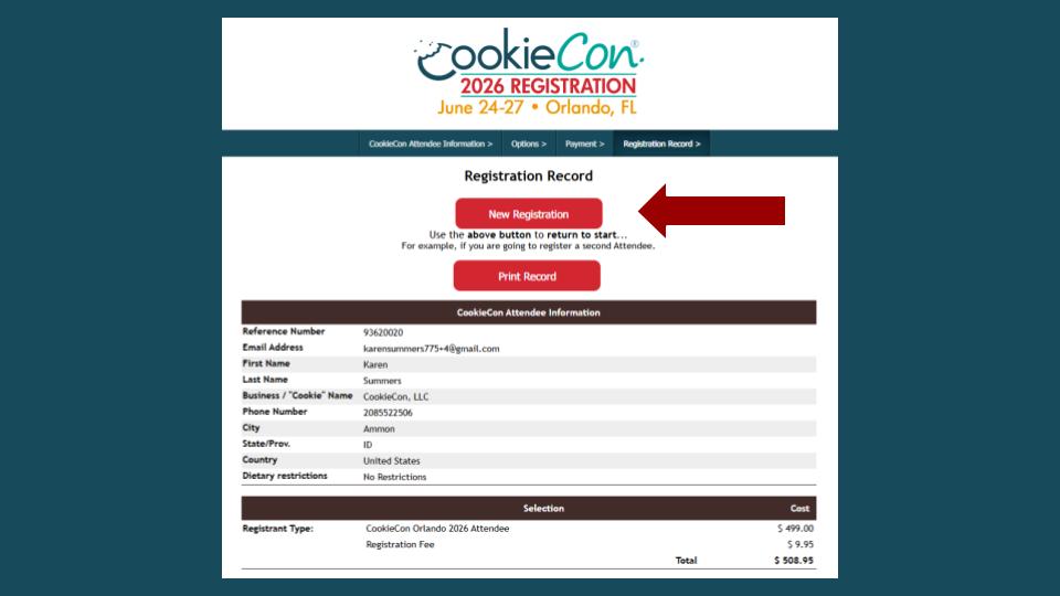 If you are registering for a second Attendee you’ll need to click that "New Registration" button. This will take you to the beginning of the process again. Simply enter the information for the second Attendee, starting with a unique email address, and then add their relevant information.